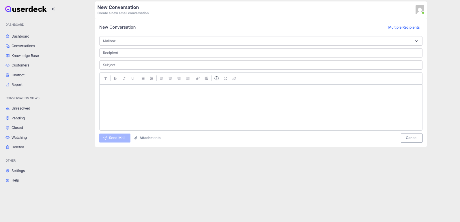 If you'd like to start a new conversation with a customer, you'll need to be logged into UserDeck and follow these steps: