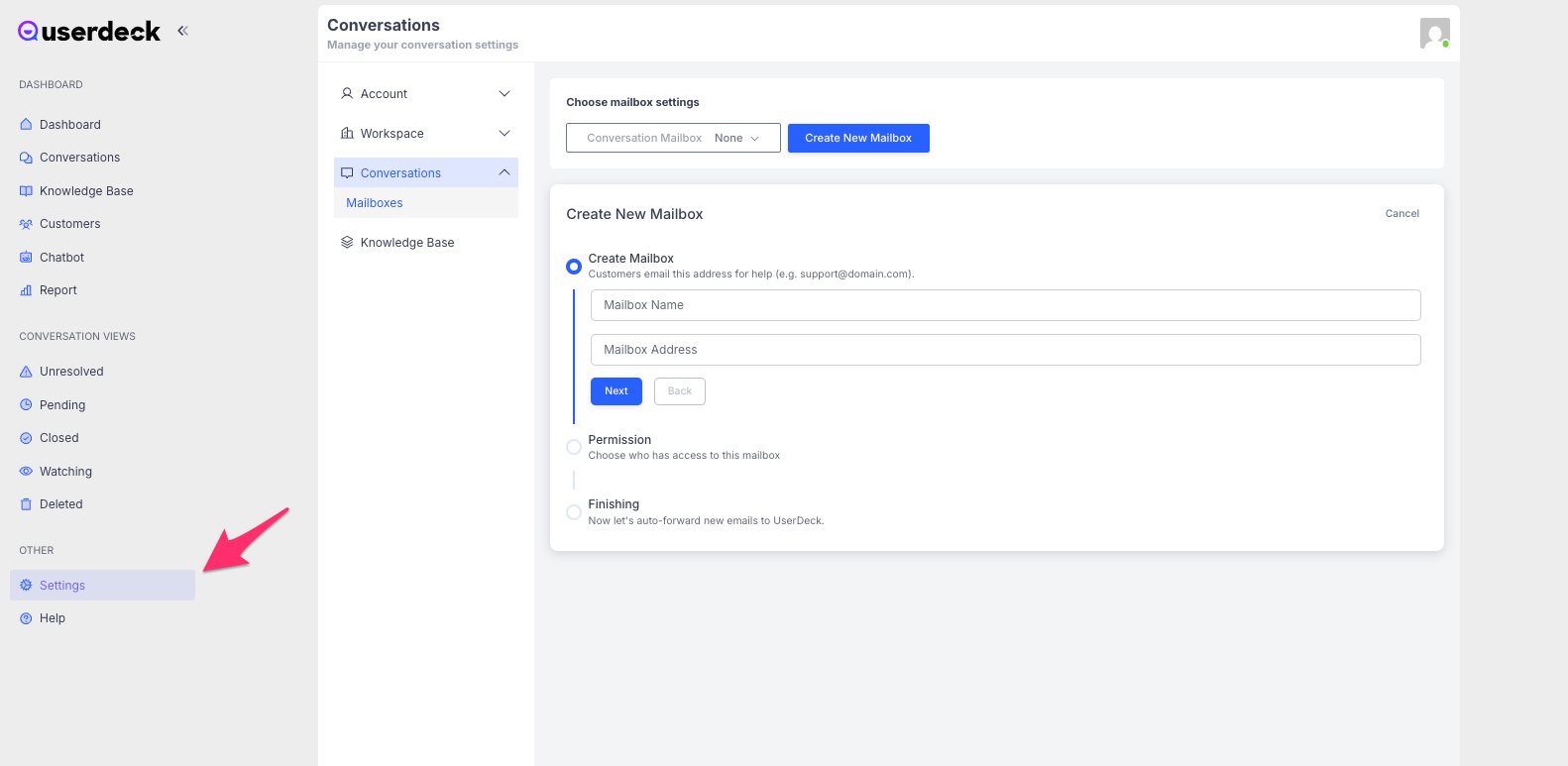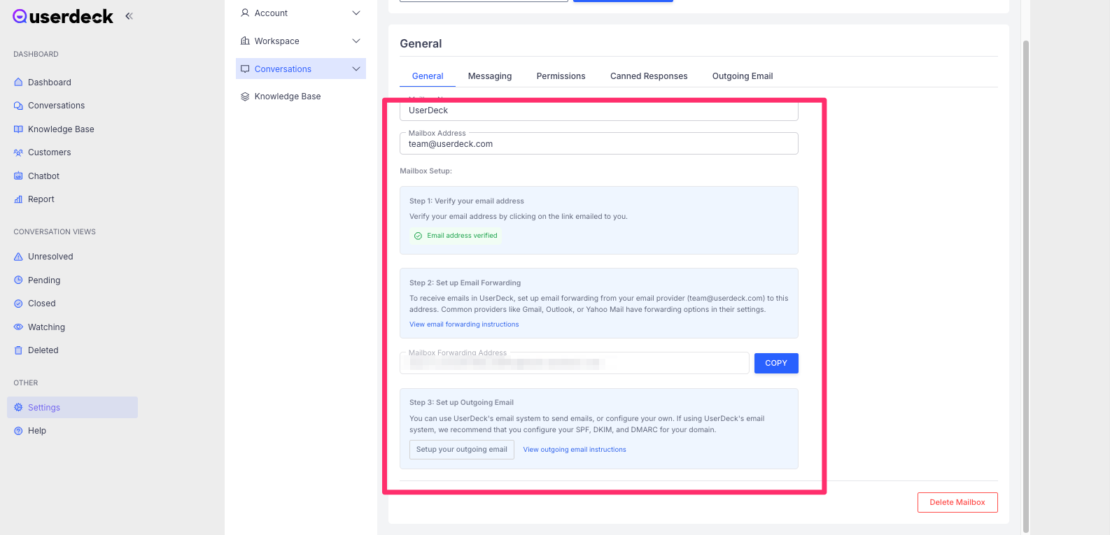 Step 2: Set up mail forwarding - to ensure UserDeck can see all emails received in your email account, you'll need to set up forwarding in your email account to forward all emails to a unique UserDeck address for your email account. Follow the instructions in the linked article.