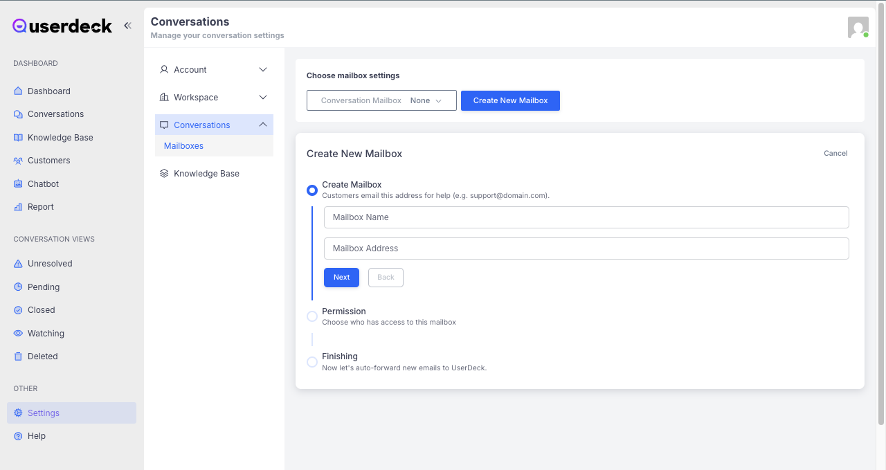 In the sidebar or settings menu, click on the Conversation tab.Click “Create New Mailbox”