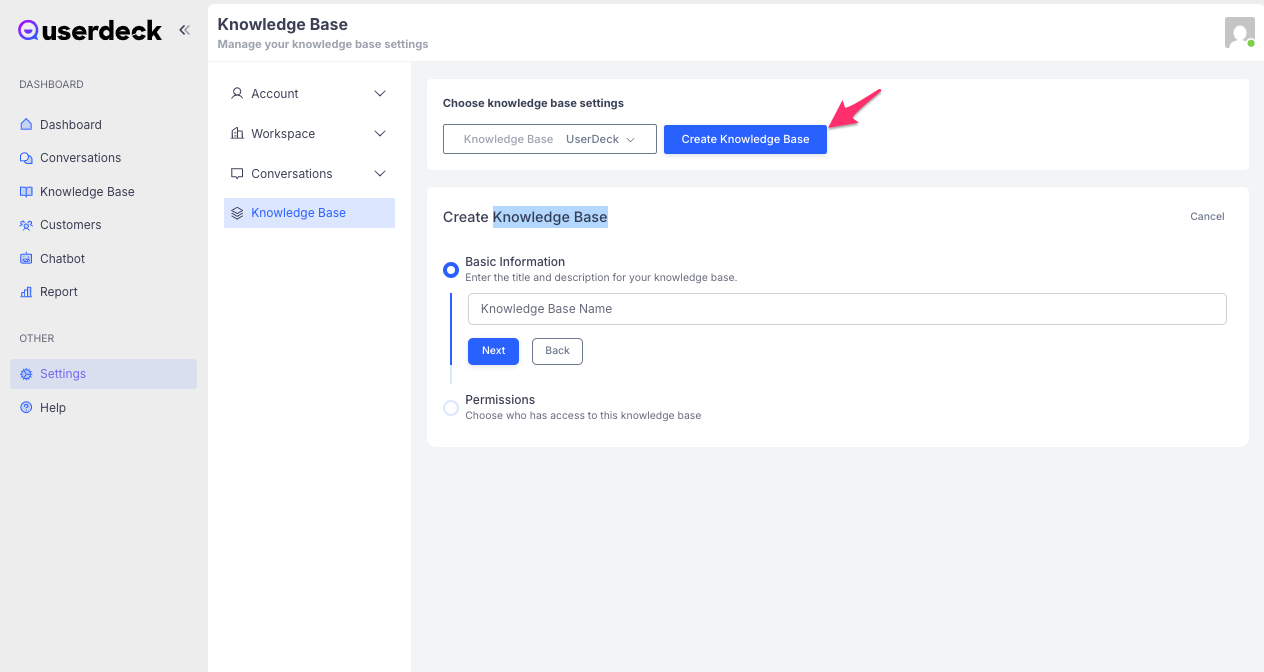 Open your dashboard and navigate to the Settings page.Select the Knowledge Base Tab